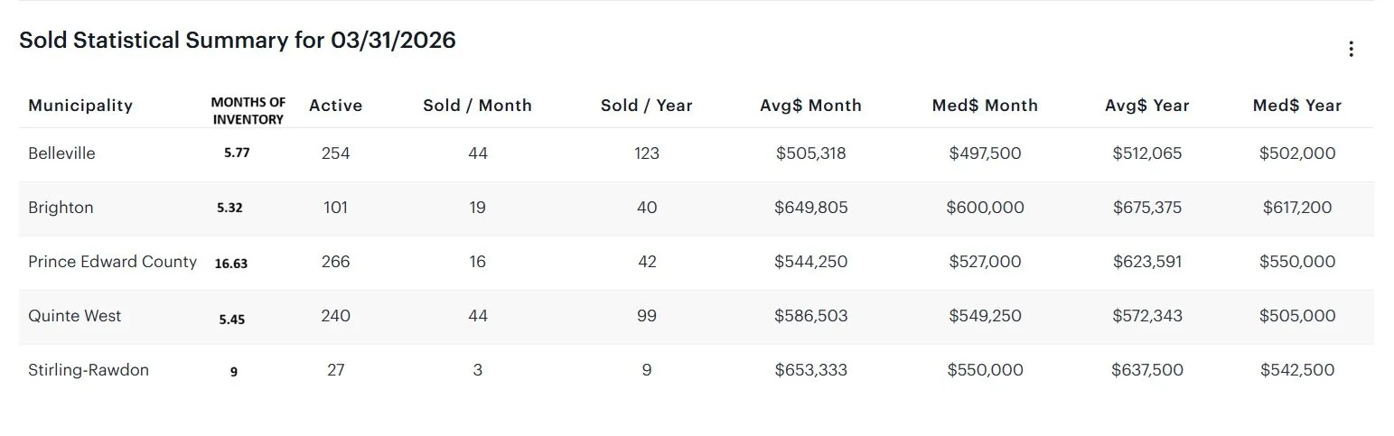 On the sales side, activity remained relatively consistent compared to February, which is a positive sign given the increased inventory. The standout was Quinte West, where sales rose 57% month-over-month (28 to 44 sales), helping to bring the absorption rate down and move conditions closer to a balanced market.